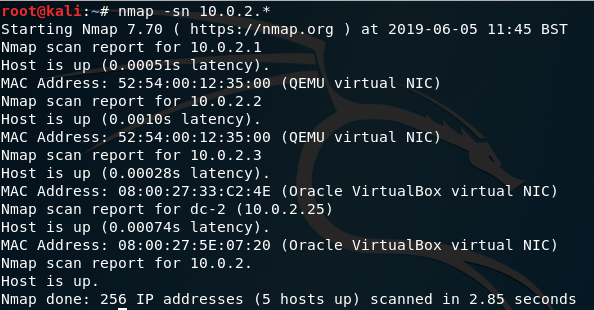 I started with a ping sweep to determine DC-2’s IP Address using nmap –sn 10.0.2.*