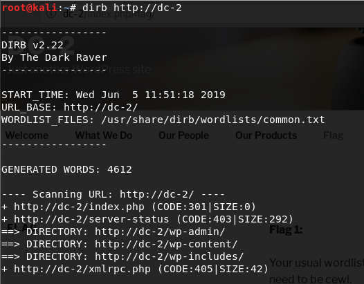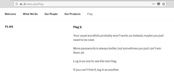 Navigating to the webpage http://dc-2 reveals the first of 5 flags, along with a hint.