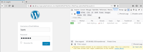 With my completed wordlist I used Hydra to brute force a login, to do this I had to collect a bit of information about how the login form is structured first. On the login page I used FireFox’s Inspect Element tool and navigated to the network tab, this will show all of the requests sent and received by the page.
