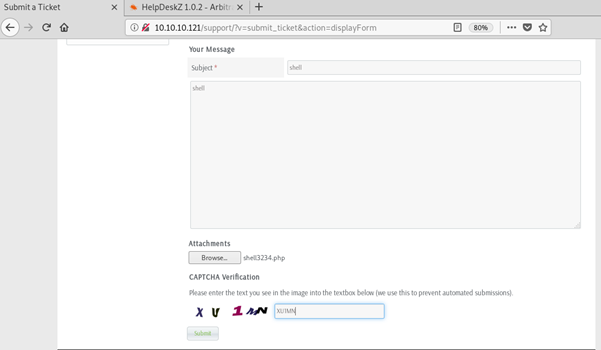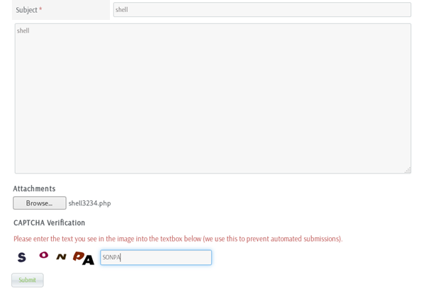 As per the instructions I filled out a ticket with a PHP reverse shell attached (I used the shell that comes with Kali Linux, /usr/share/shells/webshells/php/php-reverse-shell)