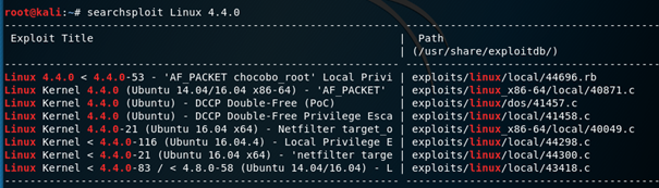 Using searchsploit linux 4.4.0 provides a small list of privilege escalation scripts.