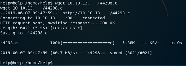 Despite being described for use on Ubuntu 16.04.4, when Help is running Ubuntu 16.04.5 the file 44298.c is the correct script in this case, I discovered this after trying a couple of the other ones unsuccessfully. I used my apache server again to download the file.