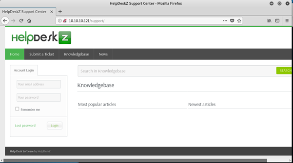 Navigating to this page opens what appears to be a help desk client which should hopefully have a vulnerability to exploit.