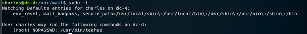 sudo -l shows that Charles has sudo rights for one binary, teehee.
