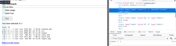 Logging in as admin with the password happy is successful (though it did take a few attempts before I realised I had to double click the login button) and navigating to the command page presents us with a list of commands that we can execute on DC-4, this is proven by running list files, executing the command ls -l, perhaps this is susceptible to command injection?