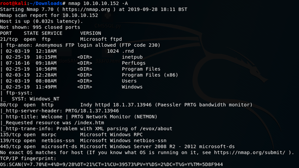 Starting with an nmap scan reveals an ftp server that is sharing way too much information and an http-server running PRTG Network Monitor.