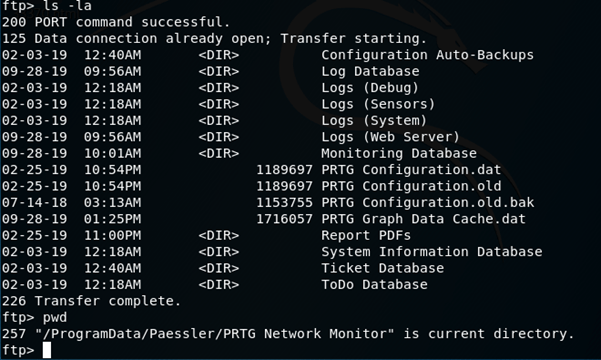 Further digging into the ftp server I eventually came across the program data directory for PRTG, located at ProgramData/Paessler/PRTG Network Monitor.