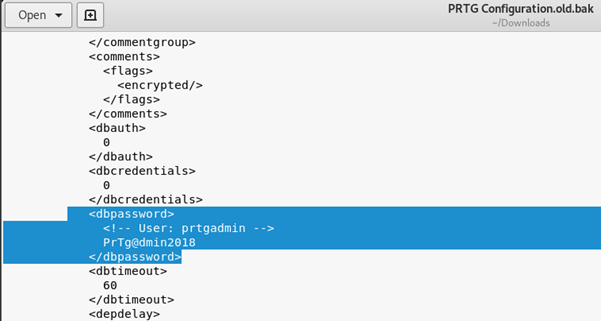 I downloaded this file and browsed through it, eventually finding what looks like a username and password, prtgadmin:PrTg@dmin2018