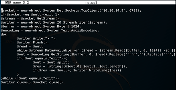 Using this knowledge I grabbed a powershell script to spawn a reverse shell and modified it to connect to my IP address on port 6789.