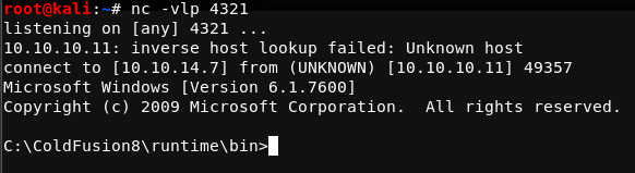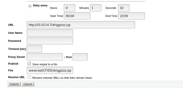 I used google to find the location of the webroot for ColdFusion 8 (ColdFusion8/wwwroot) to allow me to visit the reverse shell that I was about to upload. I also noticed that this task would be working from a different time zone so decided to have the shell upload at set intervals of 1 minute and 10 seconds, rather than risk getting the time zones wrong.