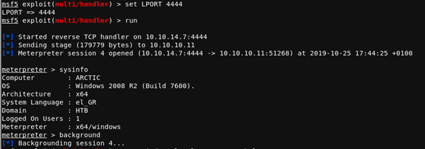 I setup a handler on metasploit and ran shell.exe on Arctic, successfully spawning a meterpreter session.