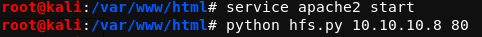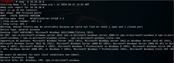 I started as usual with an nmap scan against the box, revealing HttpFileServer 2.3 running on port 80. It also confirms that this is a windows machine.