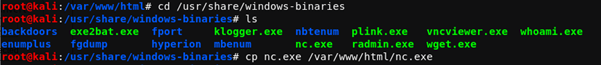 Nc.exe can be found on Kali Linux in /usr/share/windows-binaries, I just copied it to /var/www/html and started an apache2 server. Editing the script is pretty self explanatory, however it does need to be run from the same location as nc.exe, so I stored it in /var/www/html.