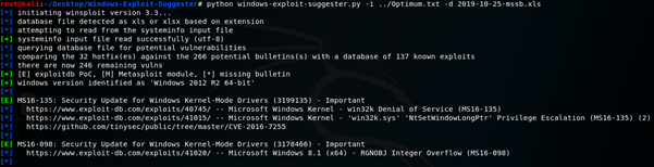 There was quite a few suggestions but some of them didn’t meet the criteria for several different reasons; one example being that an exploit required the machine to have atleast 2 processor cores, where it only had 1. I eventually settled on MS16-098 – RGNOBJ Integer Overflow. This vulnerability has an already compiled exe file that I could download, great!