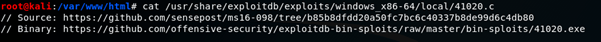 I took a look at the script to trigger the vulnerability and there is a small amount of groundwork to do before executing it; namely hosting nc.exe on a webserver and a small modification to the script to include my ip address and listen port to set up a reverse connection.