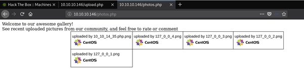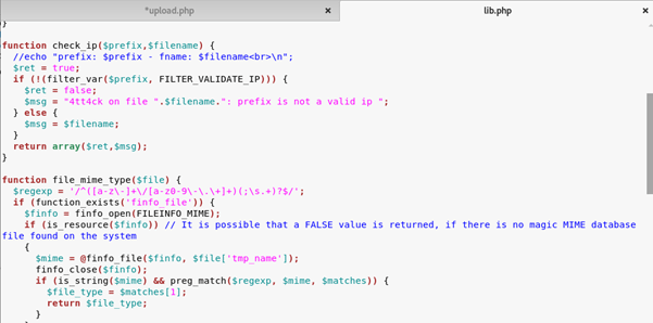 A block of code in upload.php shows that only .jpg, .png, .gif and .jpeg files can be uploaded, furthermore a block in lib.php suggests that the files are checked by mime type, this means that the files contents will be checked as well as the extension, alongside this the file name is changed to match the IP address of the user that uploaded it.