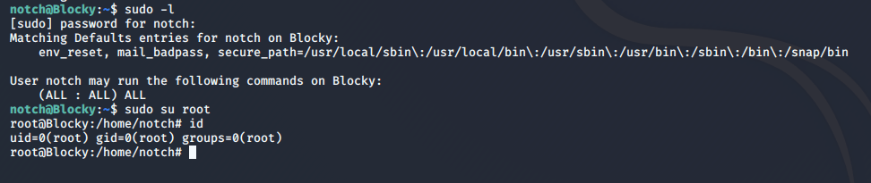 The simplest of enumeration lead me to the root account, sudo -l revealed that notch could run anything as root, and as I knew their password, so could I!