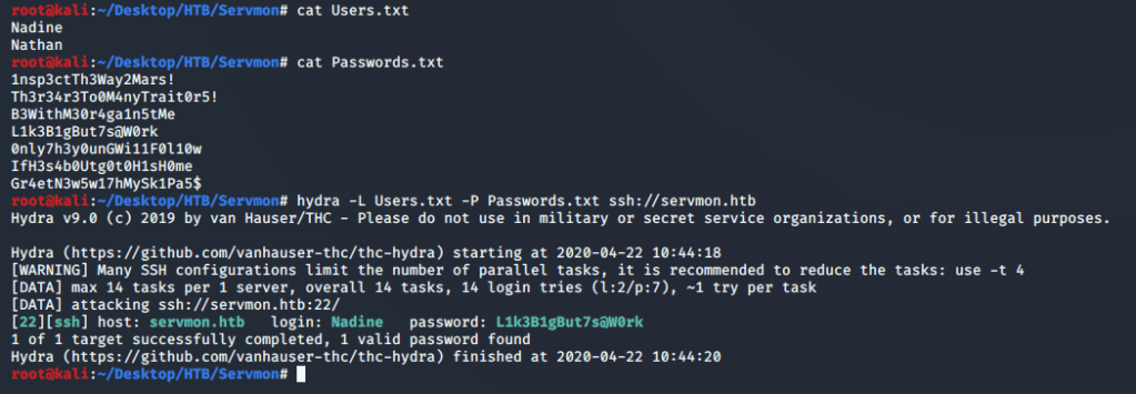 I saved these into a file – Passwords.txt and added Nadine and Nathan to a file – Users.txt, I then passed these to Hydra to try and bruteforce an SSH login, this successfully found the password to Nadines account.
