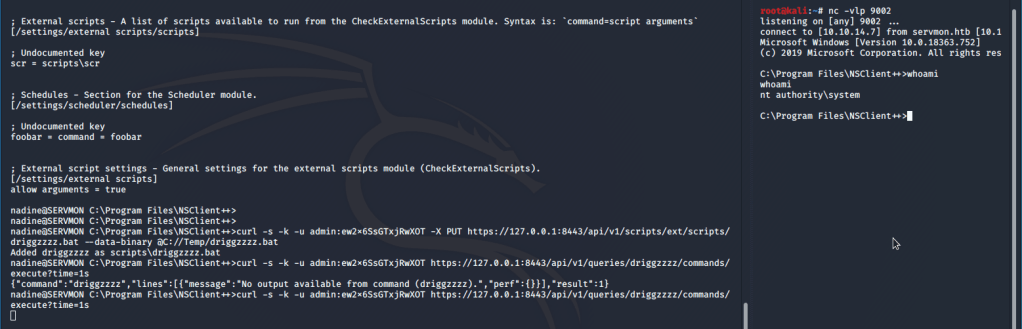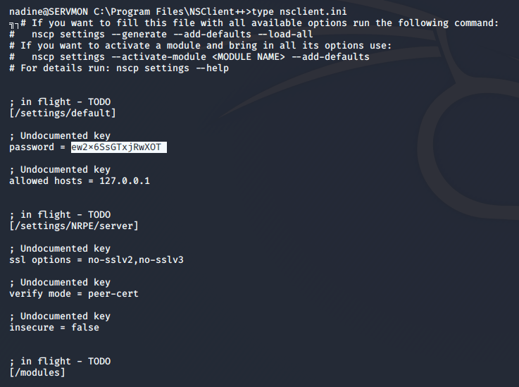 A brief overview of this exploit – NSClient stores the password for the software in plain text, this allows a user to login to the service and then upload and execute a script with Administrator rights.