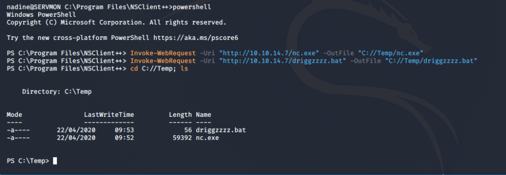 Once I was connected again, I used powershell to upload nc and a .bat script from my webserver to servmon.